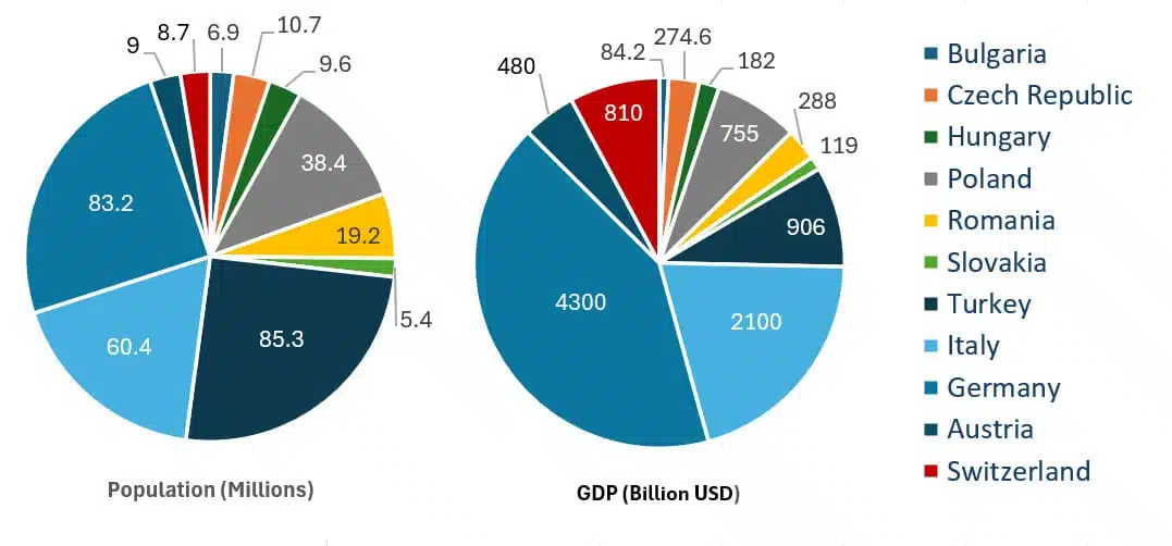 Germany leads with a robust economy, featuring the highest GDP and a strong industrial base. Italy and Turkey also showcase significant economic influence, with Italy’s economy rooted in manufacturing and exports, while Turkey’s economy is characterized by rapid growth and a large, young population. Switzerland and Austria, known for their high standard of living and stable economies, excel in finance, technology, and innovation.